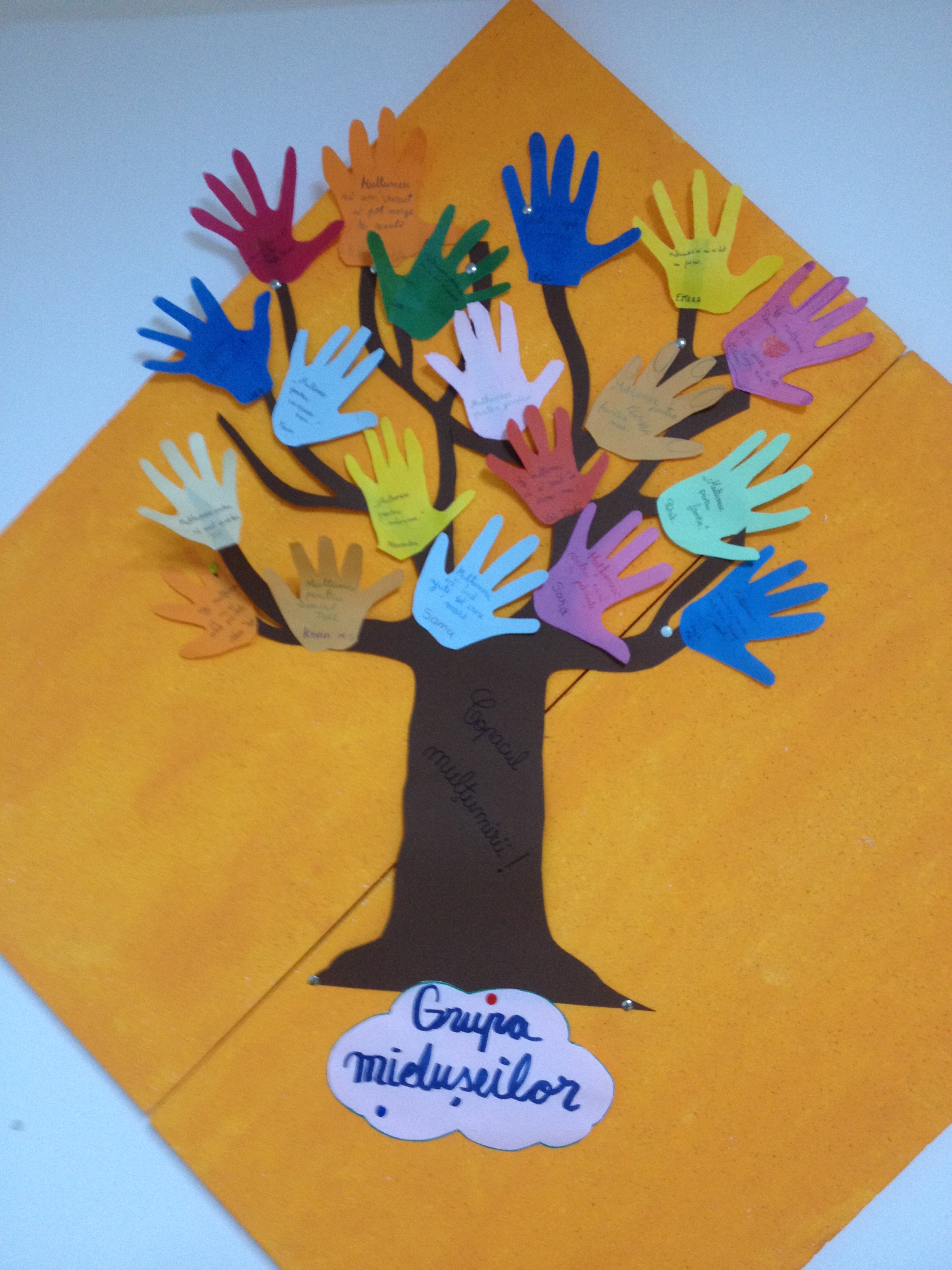 Dai-le  colicolorate, creioane si foarfeci pentru a isi desena  si decupa conturul mainii,dupa care spuneti- le sa scrie cate un motiv de multumire pe mana decupata. Ajutati-i daca e nevoie. Cand au terminat , atasati-le de copac si chemati-i pe copii la orugaciune de multumire.