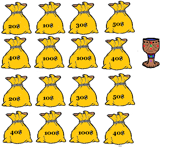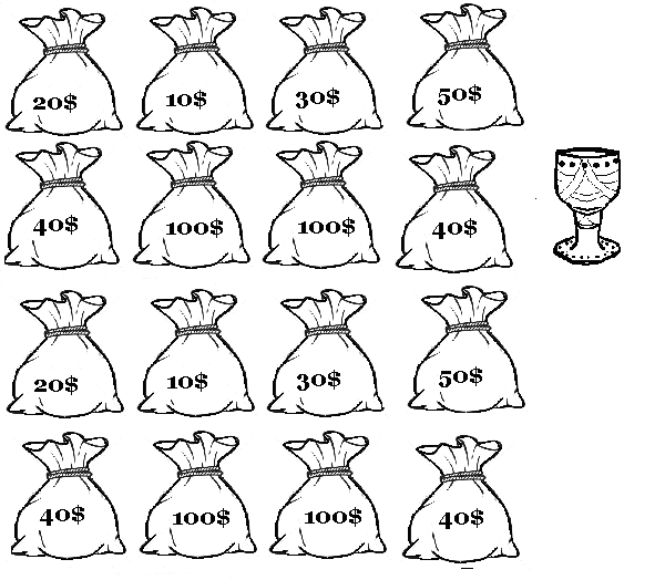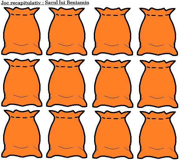Puneţi întrebări şi chemaţi la tablă reprezentantul unei echipe care a răspuns corect ( şi nu a uitat să ridice mâna sus pentru a răspunde J). Copilul va alege un sac şi va căştiga punctajul scris pe spate pentru echipa lui. Dacă va lua sacul lui Beniamin, poate alege : fie să i se dubleze suma de bani de pe scrisă pe sac, fie să mai extragă un sac.